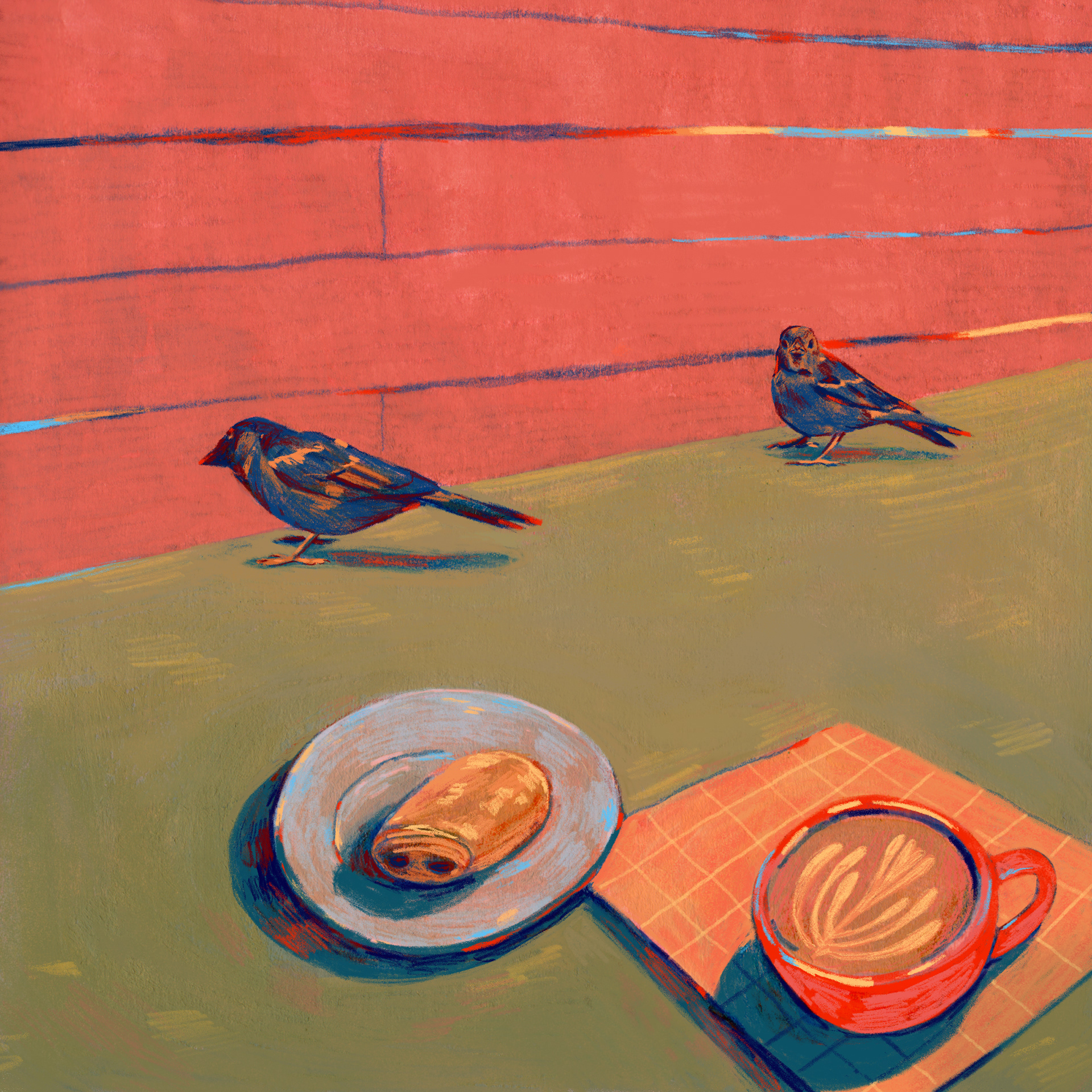 I was inspired by a photo I took while I was sipping my coffee of these two birds, carefully keeping an eye on my delicious treat. From this photo came a sketch which I then painted with gouache and completed with Adobe Fresco.
